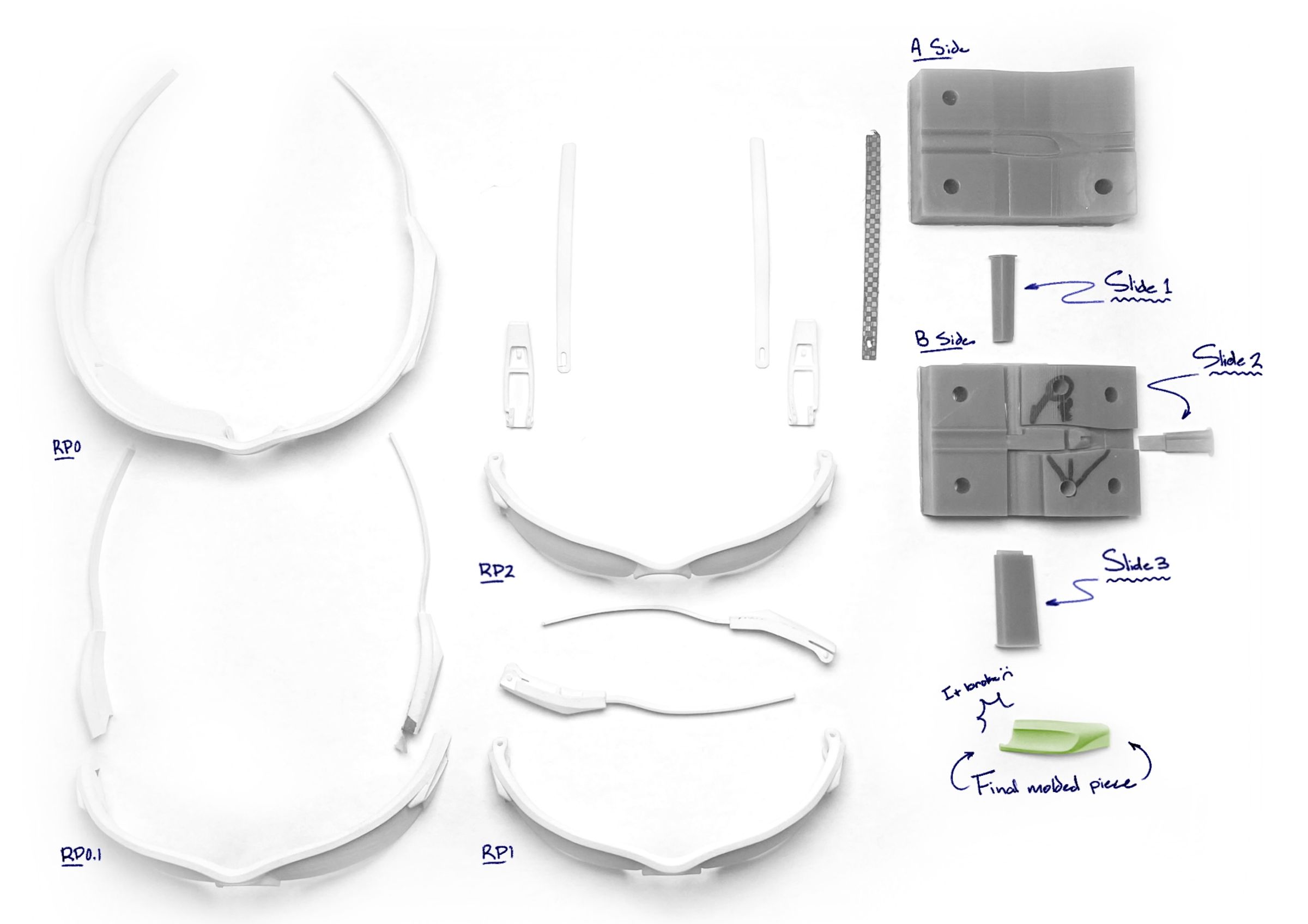 To the left is a selection of release prototypes, printed in SLS for approximate mechanical behavior. A soft tooling prototype was made for the hinge component, printed in SLA. The mold was filled with a pre-mixed two part polyurethane to validate the tools functionality.