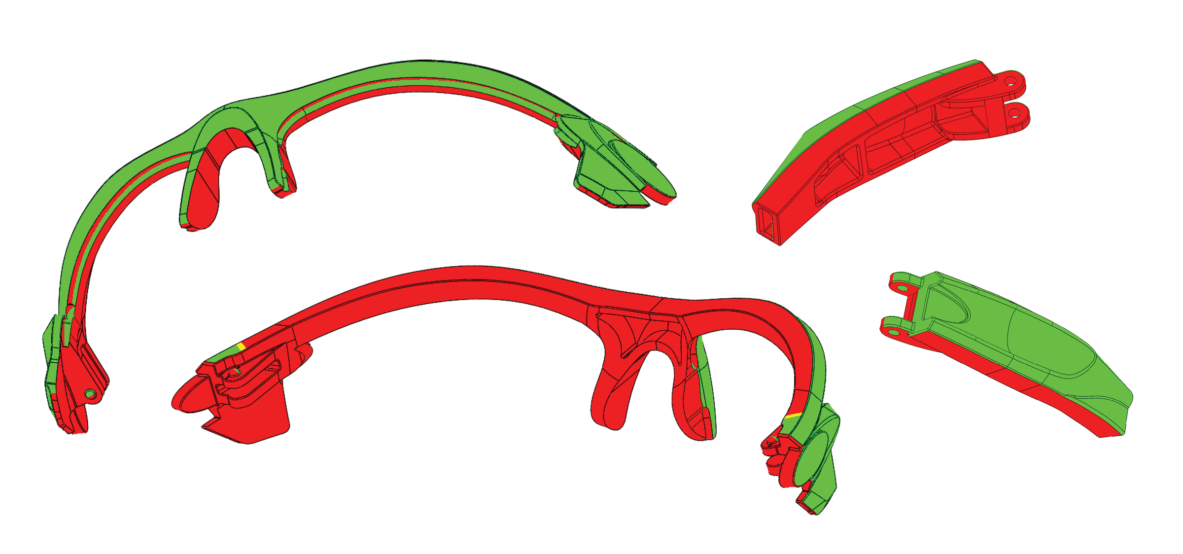 Shown is a draft analysis of the major injection molded components from the assembly. Both primary components have an A-Side and B-Side with one clean parting line. Some extra slides were necessary for mechanical features. A removable wire insert creates a detent for the lens, and prevents undercuts in the primary pull directions. All surfaces received one degree of draft, without breaking design intent.