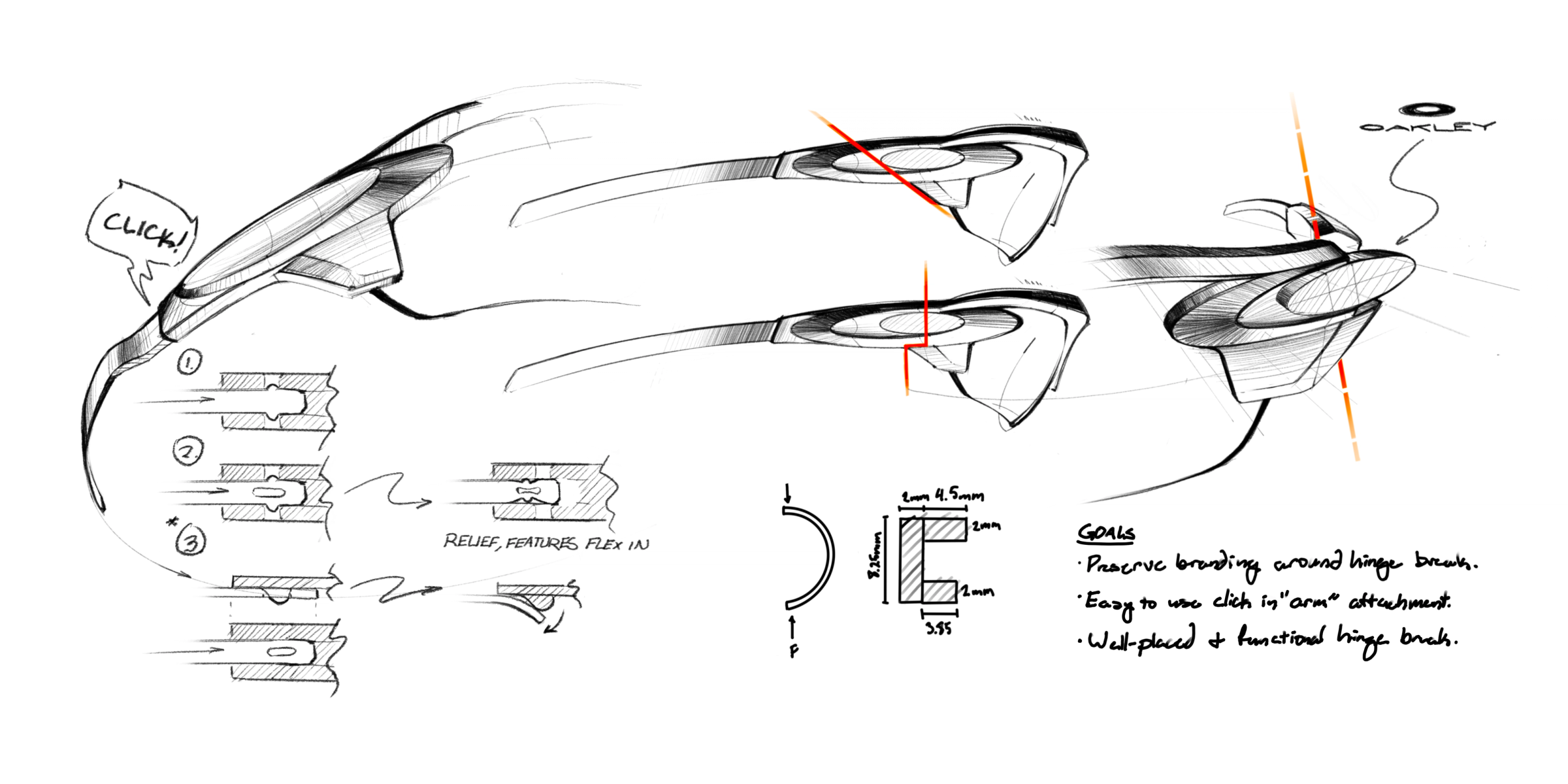 This sport eyewear concept emerged as an exploration in translating design intent into production-ready geometry. The project centers on maintaining strong form and proportion while resolving the geometric, mechanical, and manufacturing constraints of a fully manufacturable consumer product. I developed the project independently, beginning with sketching and surface exploration to establish a clear design direction, then carrying that intent through detailed CAD and manufacturing considerations. The full eyewear assembly was surfaced in SolidWorks, with all components designed for injection molding and drafted accordingly. The work required defining part breaks, hinge placement, user fit, and mechanical interfaces while preserving surface continuity and overall form quality. While limited in narrative scope, the project serves as a concentrated case study in surfacing discipline, draft control, parting strategy, and the preservation of design intent through a DFM-driven pipeline.